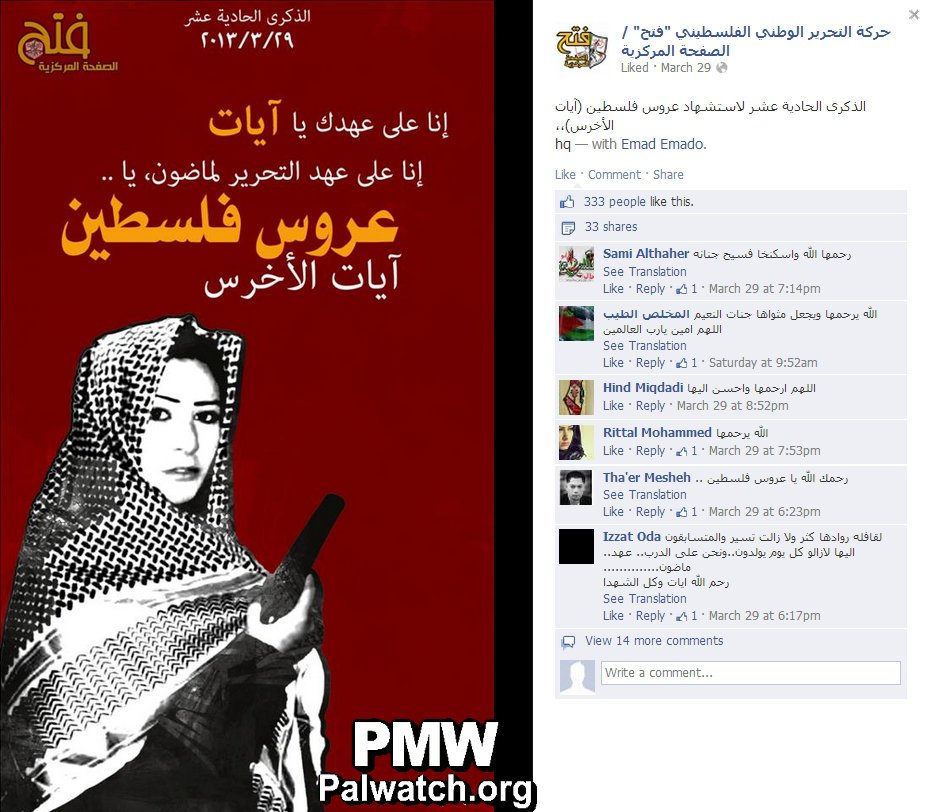 Fatah glorified two suicide terrorists who killed 6 Israelis, referring to them as “the Bride of Palestine” and “our hero” respectively. The posts honoring these two suicide bombers still appear on Fatah’s Facebook page.Fatah paid tribute to suicide bomber Wafa Idris who killed 1 and injured over a hundred Israelis during her attack in Jerusalem in January 2002. Part of the text about the terrorist read: