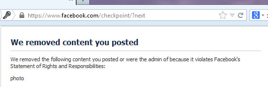 Facebook: “We removed the following content you posted or were the admin of because it violates Facebook’s Statement of Rights and Responsibilities.”
