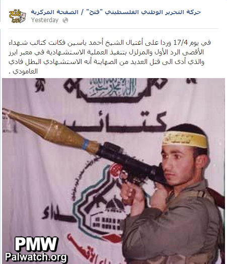 Administrator of Fatah's official Facebook page:"On April 17 [Fatah's military wing] the Al-Aqsa Martyrs' Brigades were the first to respond to the assassination of [Hamas founder and head] Sheikh Ahmed Yassin. The response was earth shattering - the Martyrdom-seeking operation at the Erez crossing (at the Israel-Egyptian border), in which many Zionists were killed. This is the Martyrdom-seeking hero Fadi Al-Amoudi."