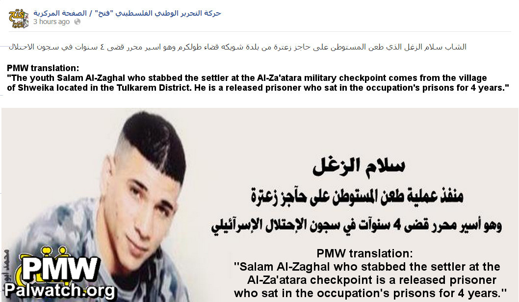 "The youth Salam Al-Zaghal who stabbed the settler at the Al-Za'atara military checkpoint comes from the village of Shweika located in the Tulkarem District. He is a released prisoner who sat in the occupation's prisons for 4 years."