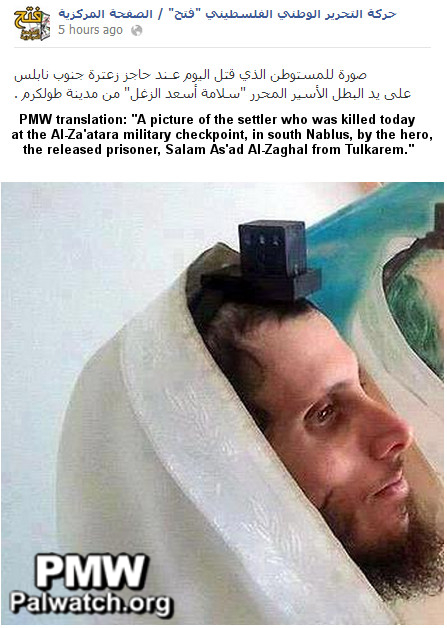 north east of the Israeli city Ariel and south of the Palestinian city Nablus in the West Bank. Fatah's Facebook page celebrated the murder and glorified the murderer. All the following pictures appear on the "main page" of the Facebook of "The Recruitment and Organization Commission" of Fatah:Fatah's Facebook page administrator: