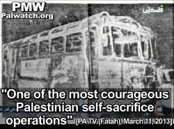 One of the attacks he planned was the Coastal Road Massacre in 1978 led by terrorist Dalal Mughrabi, in which terrorists hijacked a bus and killed 37 civilians, among them 12 children. PA TV glorified the attack on March 11, 2013, the anniversary of the hijacking, by showing a picture of the burnt out bus while glorifying the attack as "one of the most courageous Palestinian self-sacrificing operations." Strikingly, UNDP, the United Nations Development Programme, joined the PA and Fatah in their glorification of this terrorist by sponsoring the annual Prince of Martyrs Abu Jihad Football Tournament, the official PA daily reported: