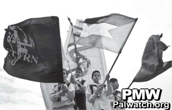 Palestinian children wave flags in front of monument in shape of "Palestine" that erases Israel, in square in town of Tubas in the West Bank.Click to view bulletin