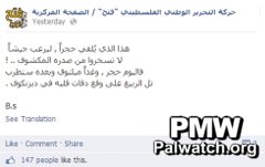 Facebook page of the Fatah Mobilization and Organization Commission:“He who throws a stone to intimidate an army – don’t ridicule his bare chest! For today this is a stone, tomorrow a Molotov cocktail and later on, Tal Al-Rabia (i.e., Tel Aviv) will sing to the rhythm of his heartbeats in Dizengoff [Street].”