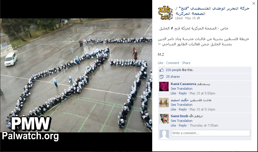 In a PA school, children formed a human map that the PA areas and all of Israel. A picture of this was posted by the administrator of Fatah’s official Facebook page with the text: “Exclusive - Fatah movement’s main page – Hebron, The Widad Nasser A-Din School in Hebron at its morning assembly”