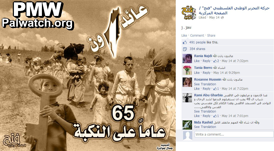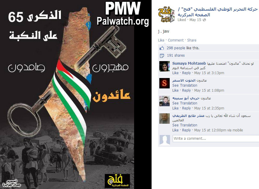 The administrator of Fatah's official Facebook page posted a picture of Palestinians walking, some with keys, and text saying "We return" and "65 years since the Nakba." In the text there is a map of the PA areas and all of Israel covered in the Palestinian flag, symbolizing political sovereignty: