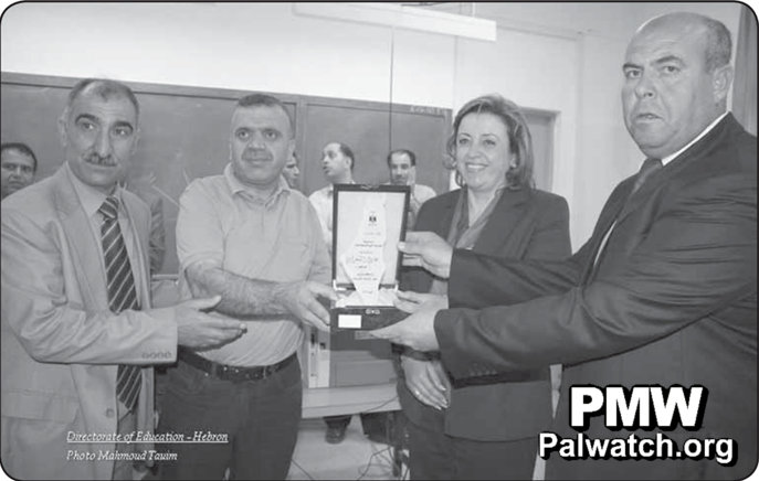 Plaque of honor, including the map of "Palestine" that erases Israel, given by the principal of a Palestinian school in Hebron to another PA education official: