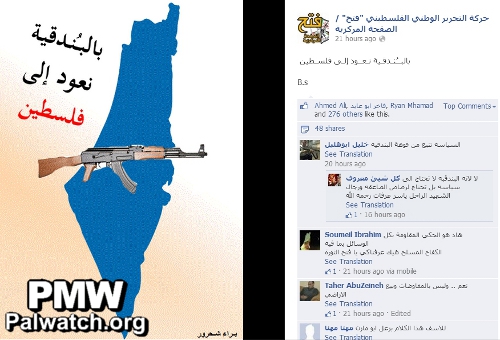 Fatah Facebook page: “We will return to Palestine by way of the gun"Fatah - The Main Page, Facebook|Jun 24, 2013Caption on photo: “We will return to Palestine by way of the gun”
