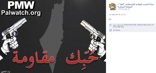 Picture on Fatah Facebook page encourages violence against IsraelFatah - The Main Page, Facebook|Jun 25, 2013Caption on photo: “Love for you is resistance”