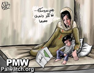 In the adjacent cartoon, a mother is showing her son a book with a map that includes all of Israel and the PA areas. The text in the book defines the map as "Palestine." The mother tells her son: "This is your bride... when you grow up you will know the dowry."