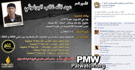 A picture glorifying 5 of the suicide bombings that Barghouti prepared explosives for and which killed 61 "Zionists" was posted by the administrator of the Fatah's Facebook page, "The Main Page." Terrorist Barghouti was honored as the "heroic prisoner" and his attacks as "self-sacrificing activity" and "Martyrdom-seeking operations." "Martyrdom-seeking operations" is the Palestinian euphemism for suicide bombings.