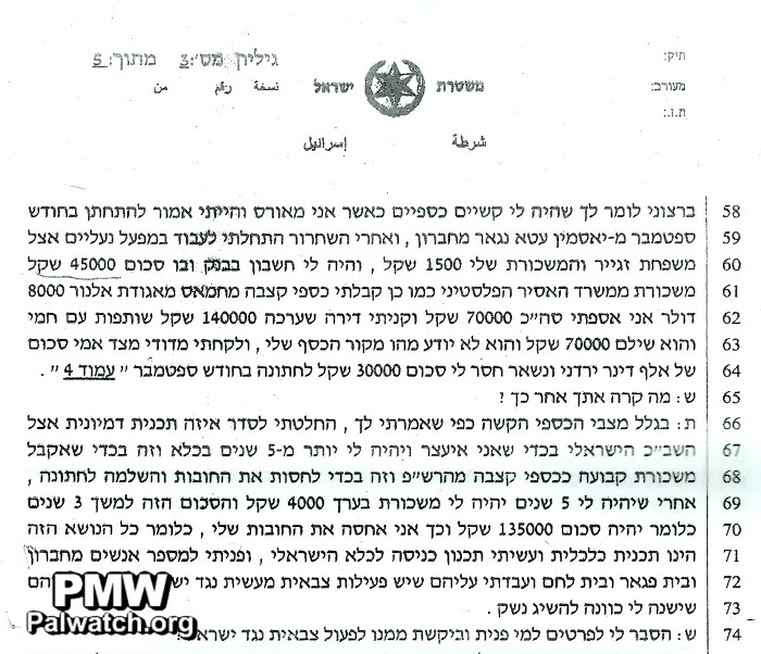 Husseini Najjar: “Because of my difficult financial situation, as I told you, I decided to arrange some kind of imaginary plan that the Israeli Security Agency [would think was real] so that I would be arrested and have more than 5 years in prison, so that I would receive a fixed salary as allowance money from the PA, and this was to cover the debts and complete [my savings] for the wedding. After I have 5 years, I will have a salary of approximately 4,000 shekels, and this sum for 3 years- in other words, it will be a sum of 135,000, and in this way I will cover my debts. In other words, this entire matter is a financial plan, and I made a plan to go into the Israeli prison and turned to a number of people from Hebron, Beit Fajjar, and Bethlehem, and I tricked them that there is a genuine military operation against Israel, and I tricked them that I have an intention to obtain weapons.”