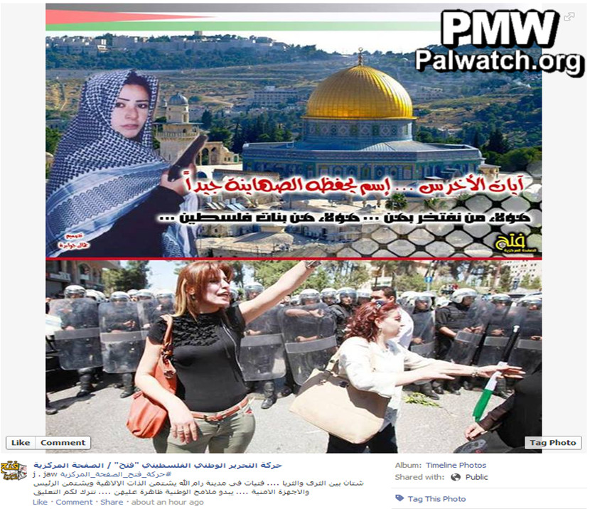 In the photo: “Ayyat Al-Akhras – a name the Zionists remember well. We are proud of them, these are the daughters of Palestine”Text: “There is no comparison – young women in the city of Ramallah curse Allah, the President [Abbas] and the [PA] Security Forces. Signs of patriotism can [‘really’] be seen in them. We leave the comments to you.”