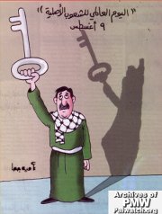 Cartoon map uses Key to claim land ownership and erase IsraelAl-Hayat Al-Jadida, official PA daily |Aug 10, 2005For many years the PA has used the Key as a Palestinian symbol of their claim to ownership of all the land of the State of Israel. Text: "International Day for Indigenous People"
