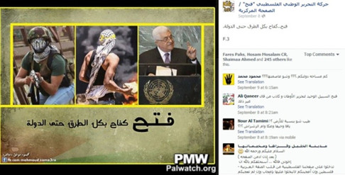 The Facebook page "Fatah - The Main Page" posted the adjacent picture under the headline "Fatah - All means of struggle until statehood."The picture of Abbas speaking at the UN represents diplomacy as a "means of struggle." The other two pictures represent the use of violence as a "means of struggle." One shows a man wearing an Arab headscarf throwing a stone, while the other shows a man holding a rifle.