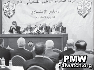 Map on Fatah poster erases Israel - at event attended by AbbasAl-Hayat Al-Jadida, official PA daily |Nov 4, 2013PA Chairman Abbas during a meeting of Fatah's Advisory Council in Ramallah. Behind Abbas, a poster displays Fatah's logo, which includes a map erasing all of Israel.