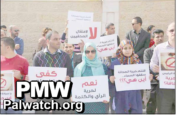 “Dozens of journalists held a sit-down strike in front of the PA Presidential Headquarters in Ramallah, to protest the arrest of and attacks on journalists by the Security Forces in recent days, and demanded that the government officially condemn the attacks and to act to prevent their recurrence. In a letter delivered to the prime minister as well as on placards displayed during the sit-down strike, the sit-down strikers called for the cessation of what [they] described as the suppression of freedoms and the silencing, arrest and persecution of journalists, while others called for respecting and strengthening freedom of the press and freedom of speech and opinion.