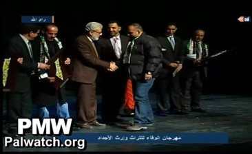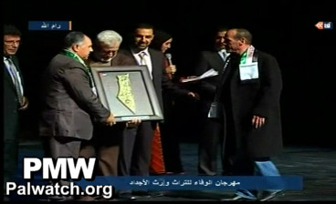 At a PA event under the auspices of Abbas, PA Minister of Culture Anwar Abu Aisha honored released terrorists by awarding them PA plaques of honor. The plaques showed a map of "Palestine," denying the existence of Israel. The terrorists were released in October 2013, part of a group of 104 terrorists whom Israel agreed to release to fulfill the PA's precondition for renewing negotiations. The honored terrorists included Asrar Samrin, who