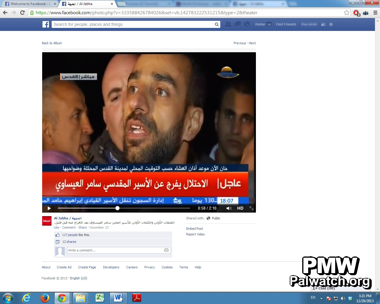 The Israeli daily Ma'ariv reported on Friday [Dec. 27, 2013] that when it asked Hadash for a response, Hadash denied the video was ever posted on the party's Facebook page. PMW has verified that the video is still running there today, Sunday, Dec. 29, 2013.