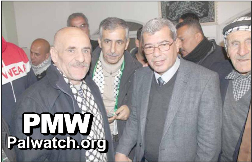 “[PA Minister of Prisoners’ Affairs Issa] Karake’s statements came during visits he made to congratulate the released prisoners in the districts of Ramallah, Nablus, Bethlehem, Tubas, Jenin and Salfit, accompanied by a delegation from the Ministry of Prisoners’ and Released [Prisoners’ Affairs]… Karake awarded them gifts in honor of their struggles and sacrifices in prison.”Photo: “[PA Minister of Prisoners’ Affairs Issa] Karake during his visit with released prisoner Ahmad Kmeil ‘Abu Al-Awad’ in Qabatiya”: