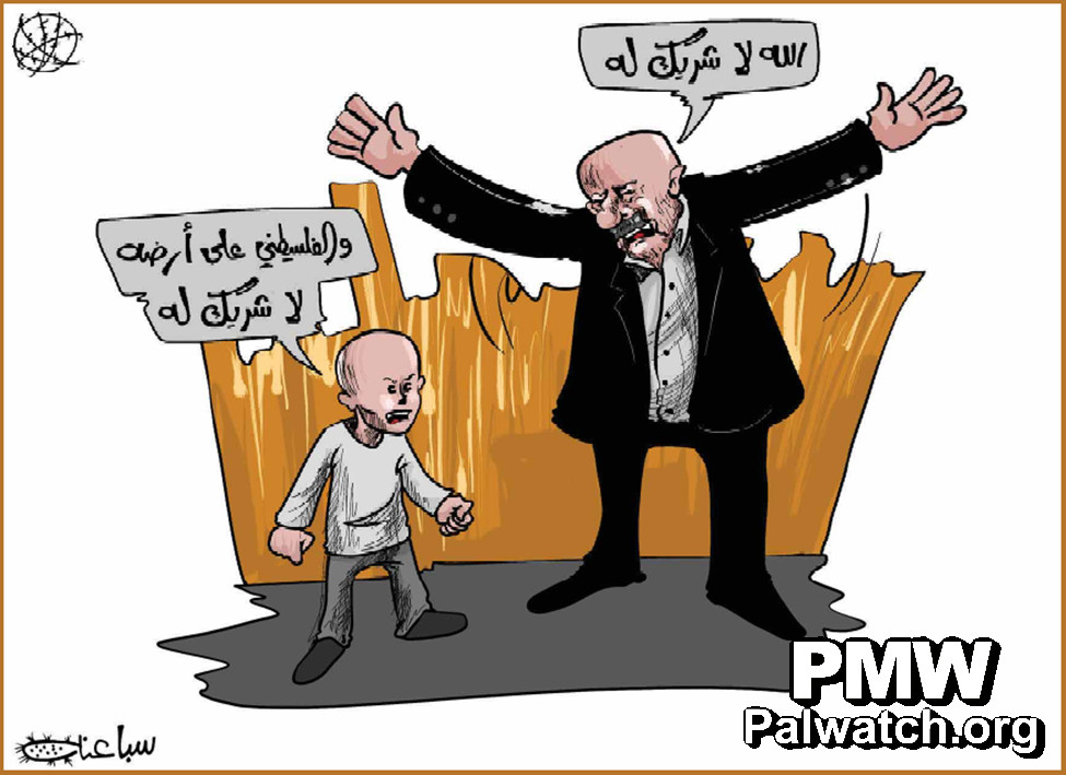 Palestinian Authority cartoon: “A Palestinian has no partner on his land”Al-Hayat Al-Jadida, official PA daily |Jan 23, 2014Adult: “Allah has no partner.”Boy: “And a Palestinian has no partner on his land.”