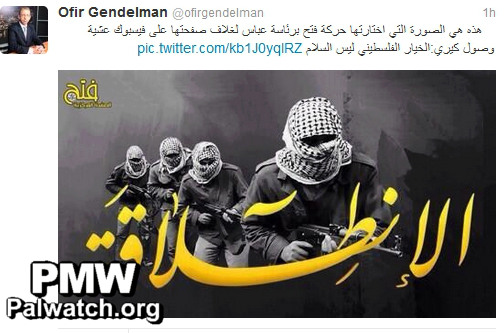 The Israeli Prime Minister's spokesman for Arabic media Ofir Gendelman posted on his Twitter account a copy of this picture below of masked men with automatic rifles, which Fatah had put on their "Main Page" on Facebook. He wrote: "This is the photo that the Fatah Movement led by Abbas chose as its Facebook page cover photo on the eve of Kerry's arrival. The Palestinian choice is not peace."