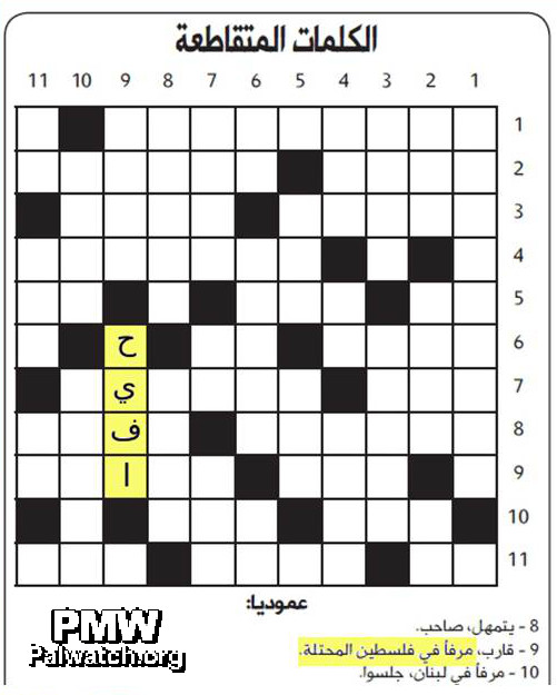 Palestinian Authority daily crossword: Haifa is "a port in occupied Palestine"Al-Hayat Al-Jadida, official PA daily |Feb 4, 2014Clue: "A port in occupied Palestine" Solution: "Haifa"Click to view bulletin » View analysis citing this item
