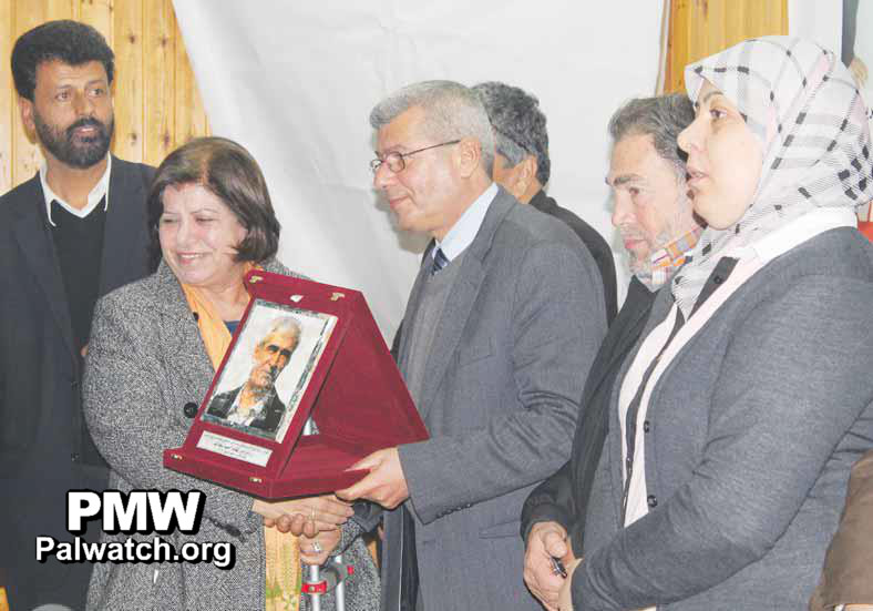 Among the terrorists honored at the ceremony were Ahed Abu Gholmeh, who is serving a life sentence for planning the murder of Israeli Minister of Tourism Rehavam Ze'evi ("Ghandi") in 2001, and Ahmad Sa'adat, who is serving a 30-year sentence for heading the PFLP terror organization. A song played at a PFLP event praised Sa'adat for planning the murder of the Israeli minister, but he has not been tried for this crime.