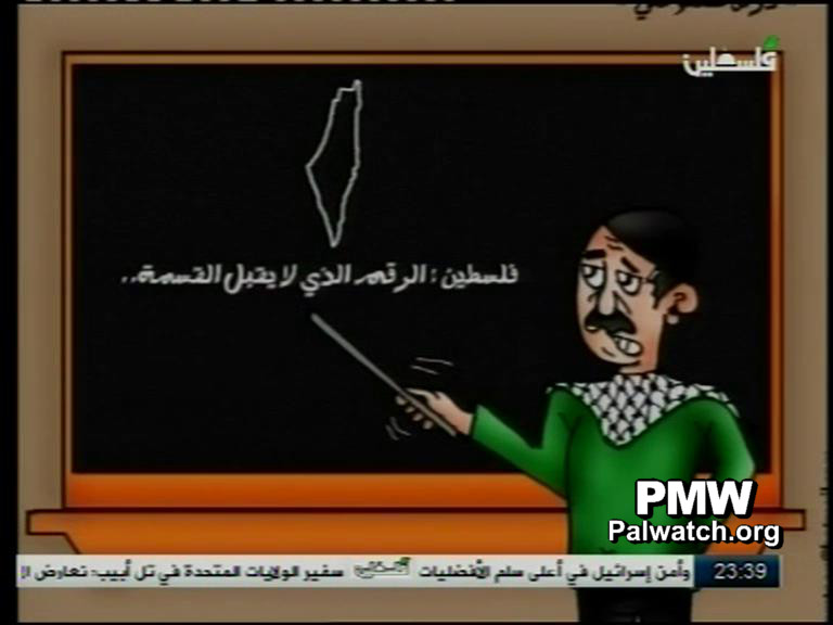 Even during the current negotiations with Israel, the Palestinian Authority continues to disseminate maps that exclude the existence of Israel by presenting all of the land as "Palestine." Official PA TV broadcast a cartoon last month that showed a math teacher pointing to a map of "Palestine" as an example of "a number that is indivisible." The map included both PA areas and all of Israel.