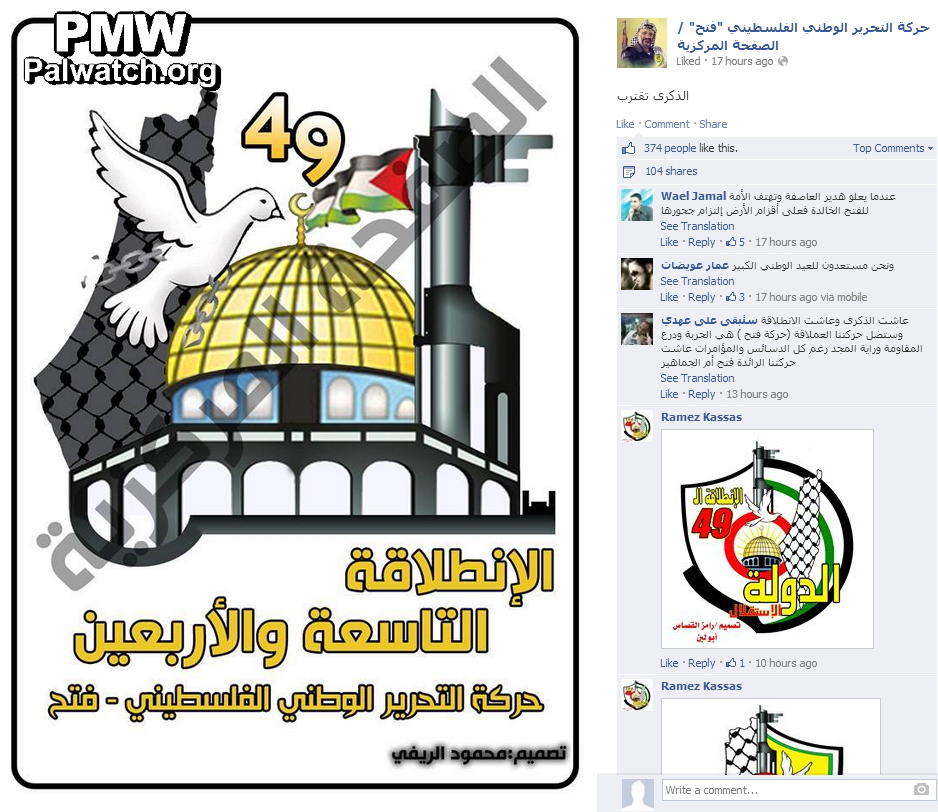 Text: "The 49th anniversary of the Intilaqa, (i.e., the "launch" of Fatah. Refers to the day of Fatah's first terror attack against Israel in 1965 when it tried to blow up Israel's National Water Carrier.)The National Palestinian Liberation Movement, Fatah."