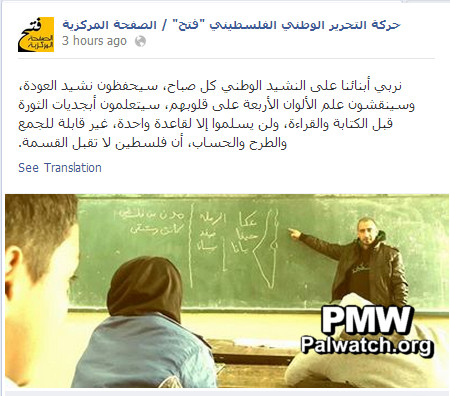 Fatah also continues to promote this idea. Fatah's Facebook administrator recently stated that before teaching them "to read and write," Palestinians teach their children that "Palestine" is indivisible, so that they "will only agree to one rule, which cannot be added to, subtracted from, or calculated: that Palestine cannot be divided":