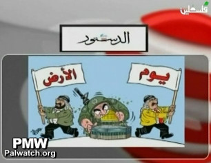 Official PA broadcast on its show Circle of Events a cartoon from the Jordanian newspaper Al-Dustur depicting Israel as a monstrous soldier gorging on the Dome of the Rock Mosque, while a Hamas activist holding a flag with the word "Land" and a Fatah activist holding a flag with the word "Day" commemorate the Palestinian Land Day.Click to view bulletin