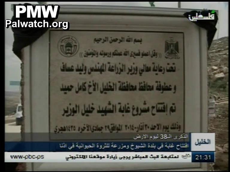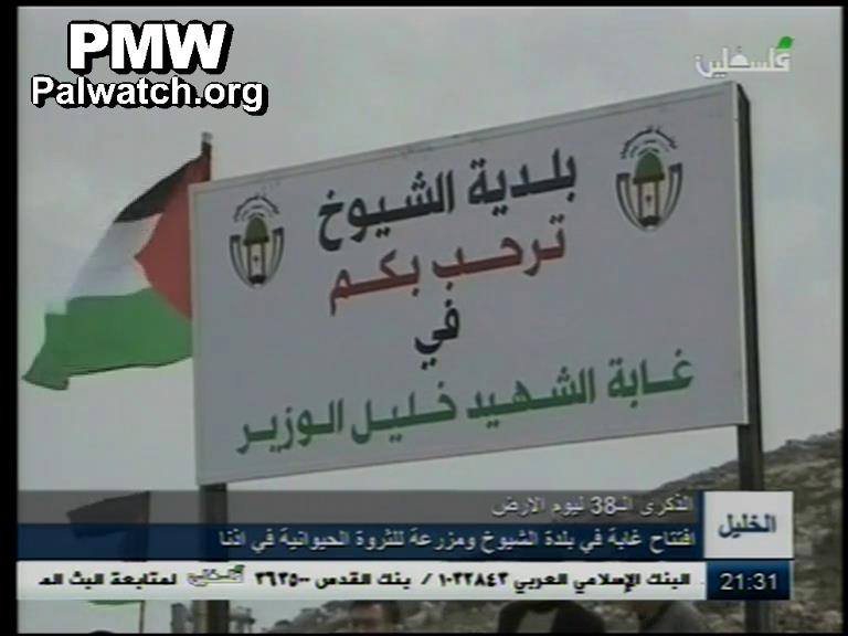 PA TV broadcast footage from the inauguration ceremony of a forest named after arch-terrorist Abu Jihad. In the forest, the PA erected a monument with logos of the PA Ministry of Agriculture and the Municipality of Al-Shuyoukh and the following text: