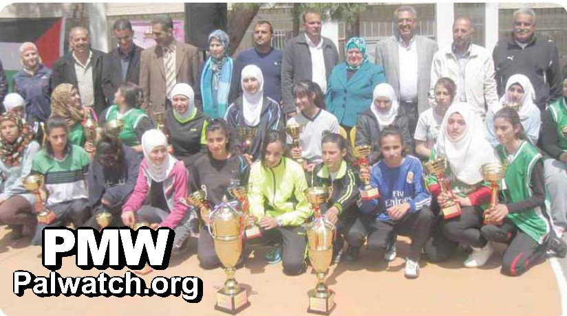 “The Bethlehem Education Administration team won the first place cup in the main athletics tournament for girls. The tournament, organized by the General Administration of Student Activities in the [PA] Ministry of Education, was held in the fields of the Turmusaya High School for Girls in the district of Ramallah and El-Bireh. The tournament, named [after] Martyr (Shahid) Abu Sukkar, was attended by Director of Student Activities in the Ministry of Education, Ilham Abd Al-Qader Muhaisen, Deputy Director of the Ramallah Education Administration Qais Nabhan and Ribhi Abu Al-Humum, the Mayor of Turmusaya.”