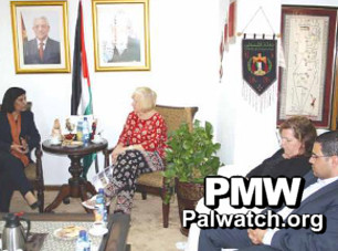 On the photo from the meeting, a map of “Palestine” showing the PA areas and all of Israel can be seen hanging on the wall in the office of PA Minister of Women's Affairs Rabiha Dhiab.