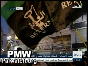 PA TV broadcast a march in Ramallah marking the 66th anniversary of the "Nakba" (i.e., “the catastrophe,” Palestinian term for the establishment of the State of Israel). A flag at the march showed a map of Israel and the PA areas, with a key over it and the word "Return."