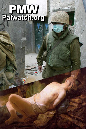 One example of such modified artwork is Raphael's The Deposition, (1507), which shows the dead Jesus being carried to his tomb. In the Palestinian version, Jesus' legs have been replaced by a photo of the wounded legs of a Palestinian, being carried away by a man as an Israeli soldier looks on.
