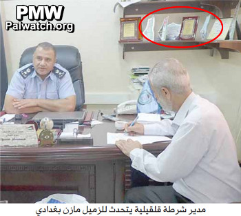 The PA daily published this picture from the office of the head of Qalqilya police. In the top right corner of the picture, there are a number of map ornaments that erase Israel. One of the maps is covered in the colors of the Palestinian flag.