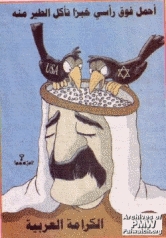 Israel as ravenAl-Hayat Al-Jadida, official PA daily |Oct 21, 2006Text on man: "Arab honor" Top text: "On my head, there is a bread that the birds are eating." (Muslim proverb)
