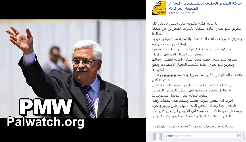 Fatah’s Facebook page, “Fatah – The Main Page” posted a response to the criticism PA Chairman Mahmoud Abbas has received for his speech to the foreign ministers of the Islamic countries in which he condemned the kidnapping of the three Israeli youths Eyal Yifrah, Gilad Shaar, and Naftali Fraenkel, who were abducted on June 12, 2014: