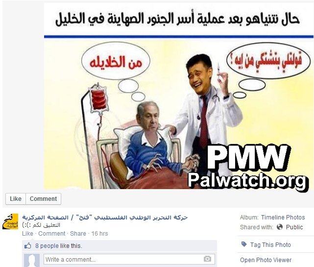 Abbas' Fatah movement posted yet another cartoon mocking Israel for not finding the three missing boys. The cartoon showed Netanyahu in a hospital bed, “bothered by” “the residents of Hebron” – a tribute to Palestinian Hebron residents, as the kidnapping occurred near this town.