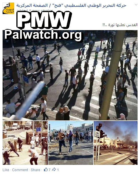 Mahmoud Abbas' Fatah heats up confrontational atmosphere: "Blood demands blood" "Jerusalem, declare a revolution!" by Itamar Marcus and Nan Jacques Zilberdik![]() ![]() One post repeated Arafat's infamous statement calling for Palestinians to become Martyrs in Jerusalem, adding that "blood demands blood": "Blood demands blood; millions of Martyrs (Shahids) are marching to Jerusalem." [Facebook, "Fatah - The Main Page," July 3, 2014] In another post (above) showing a photo of burning tires and a child throwing a stone, Fatah stated that "I am Palestinian only through my struggle" and "my stone is my weapon":"My mother taught me that my stone is my weapon; that I am Palestinian only through my struggle; she taught me to shout that this is my land, so get out!" [Facebook, "Fatah - The Main Page", July 2, 2014] Yesterday, Palestinian Media Watch reported that Fatah had posted another threat to Israelis:"An oath in the name of the Lord of the Universes, O sons of Zion: blood for blood" [Facebook, "Fatah - The Main Page," July 1, 2014] "Jerusalem, declare a revolution!" another post called. [Facebook, "Fatah - The Main Page," July 3, 2014] ![]() Another post repeated a statement by PA Deputy Minister of Prisoners' Affairs and Fatah Revolutionary Council member Ziyad Abu Ein, who hinted that Israelis are not safe by stating that "there is no sacredness to the occupation, its settlers and their security." [Facebook, "Fatah - The Main Page", July 2, 2014]Fatah Commissioner for Mobilization and Organization and Fatah Central Committee member Mahmoud Al-Aloul also posted a call for uprising: ![]() "Rise up, rebels of Jerusalem, rise up for the soul of Muhammad [Abu Khdeir] (i.e., the Palestinian teen who was kidnapped and murdered), and [for] all the Martyrs (Shahids) of Palestine." [Official Facebook page of Fatah Central Committee member Mahmoud Al-Aloul, July 2, 2014] Fatah Commissioner for Mobilization and Organization and Fatah Central Committee member Mahmoud Al-Aloul posted a message that condemned the "Nazi" kidnapping and murder of the youth Muhammad Abu Khdeir, and threatened Israel: "We warn the settler herds and the occupation state not to continue in their transgressions, and [we warn them that] our response will be severe - an eye for an eye, a tooth for a tooth." [Facebook page of Fatah Commissioner for Mobilization and Organization, and Fatah Central Committee member Mahmoud Al-Aloul, July 3, 2014] Al-Aloul posted this with the hashtags #ThirdIntifada and #Palestinerevolts.Palestinian Media Watch has documented that Fatah uses Facebook to promote violence. On June 12, 2014, three Israeli teens were kidnapped while hitchhiking in the West Bank. The boys' bodies were found by Israeli security forces near Hebron on June 30, 2014. They appeared to have been shot to death soon after the abduction. Two days later, a Palestinian teen was kidnapped and murdered in Jerusalem, in what Palestinians believe was a revenge attack by Israelis, although this is not confirmed. Following this murder, Palestinians took to the streets of eastern Jerusalem in violent protests. The following are the posts on Fatah's Facebook page: Text with image of Arafat: "Blood demands blood; millions of Martyrs (Shahids) are marching to Jerusalem." Text: "Jerusalem, declare a revolution!" Text: "Fatah Revolutionary Council member [and PA Deputy Minister of Prisoners' Affairs] Ziyad Abu Ein [said], in a statement to the press a short while ago: 'Our blood is the most sacred thing, [but] there is no sacredness to the occupation, its settlers and their security.'" [Facebook, "Fatah - The Main Page", July 2, 2014] Text: "My mother taught me that my stone is my weapon; that I am Palestinian only through my struggle; she taught me to shout that this is my land, so get out!" [Facebook, "Fatah - The Main Page", July 2, 2014] Note: The Facebook page where these items were posted, called "Fatah - The Main Page," is an official Fatah Facebook page. The page defines itself as belonging to the Fatah Mobilization and Organization Commission, and the commission's official website links to this Facebook page.Image and text posted on the Facebook page of Fatah Commissioner for Mobilization and Organization and Fatah Central Committee member Mahmoud Al-Aloul: The text on the left is a "message from the United National-Islamic Leadership in Jerusalem." (This is the first proclamation published by this body, and it is unclear whether such a leadership even exists -Ed.) The message condemns the "Nazi" operation of the kidnapping and murder of the youth Muhammad Abu Khdeir. The third paragraph of the proclamation threatens: "We warn the settler herds and the occupation state not to continue in their transgressions, and [we warn them that] our response will be severe - an eye for an eye, a tooth for a tooth." Mahmoud Al-Aloul posted this with the hashtags "Third Intifada" and "Palestine revolts." [Facebook page of Fatah Commissioner for Mobilization and Organization, and Fatah Central Committee member Mahmoud Al-Aloul, July 3, 2014] Text from the official Facebook page of Fatah Commissioner for Mobilization and Organization and Fatah Central Committee member Mahmoud Al-Aloul:Fatah Commissioner for Mobilization and Organization and Fatah Central Committee member Mahmoud Al-Aloul: "Rise up, rebels of Jerusalem, rise up for the soul of Muhammad [Abu Khdeir] (i.e., the Palestinian teen who was kidnapped and murdered, possibly for nationalistic reasons in revenge for the kidnapping and murder of three Israeli teens), and [for] all the Martyrs (Shahids) of Palestine. As of this moment, the clashes in Jerusalem's Shuafat [neighborhood], which have lasted for over 11 hours, [have left] over 100 Palestinians wounded." [Official Facebook page of Fatah Central Committee member Mahmoud Al-Aloul, July 2, 2014] |