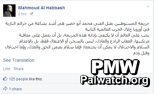 “The crime of the murder of the youth Muhammad Abu Khdeir by settlers is uglier than the crimes of the Nazis in Europe during World War II. The world must not be satisfied with condemning the crime, but must act to punish its perpetrators. The deterrent and just punishment is not merely jail or imprisonment, but execution. Peace and the occupation cannot coexist; either a peace that will ensure truth and justice, or occupation, killing and blood.”Note: On June 12, 2014, Israeli teens Eyal Yifrach, Gilad Shaar and Naftali Frenkel were kidnapped while hitchhiking in the West Bank. The boys' bodies were found by Israeli security forces near Hebron on June 30, 2014. They appeared to have been shot to death soon after the abduction. Two days later, Palestinian teen Muhammad Abu Khdeir was kidnapped and murdered in Jerusalem in a revenge attack by Israeli extremists. Following this murder, Palestinians took to the streets of eastern Jerusalem in violent and continuous protests. Prime Minister Benjamin Netanyahu and other Israeli ministers immediately condemned the revenge killing in the strongest terms. Israeli police arrested six Israeli suspects on July 6th; under interrogation, three of the suspects confessed to murdering Khdeir.