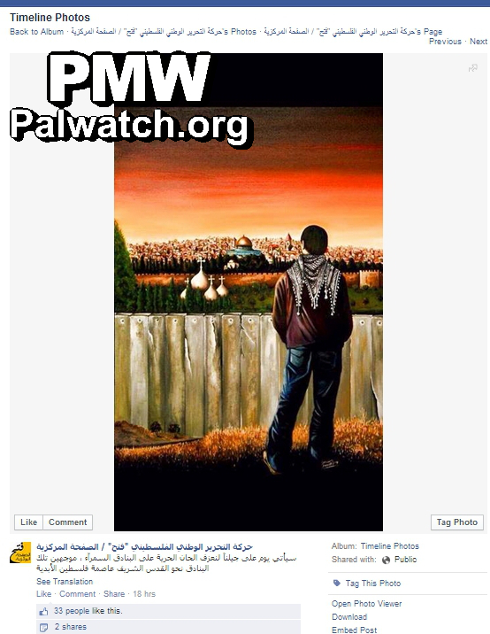 Posted on Fatah’s Facebook page, “Fatah – The Main Page”Text: “A day will come in our generation when we will play the melody of freedom on the black rifles, as we turn these rifles toward Jerusalem, the eternal capital of Palestine.”