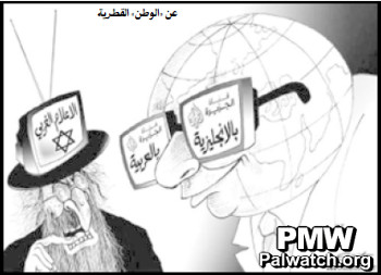 Jews control mediaAl-Hayat Al-Jadida, official PA daily |Nov 18, 2006Jew depicted as controlling Western media, world media via Al-Jazeera news channel.Text on television on Jew: Western MediaText on glasses on world: "Al-Jazeera channel in English and Arabic"