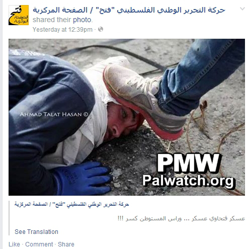 Published on Fatah’s Facebook page, “Fatah – The Main Page”Text: “Fatah’s army broke the settler’s head.”