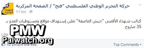 Posted on Fatah’s Facebook page, “Fatah – The Main Page”Text: “The Al-Aqsa Martyrs’ Brigades – ‘Al-Asifa’ (Fatah’s military unit) admit to having targeted the enemy’s bases and settlements with 35 rockets.”