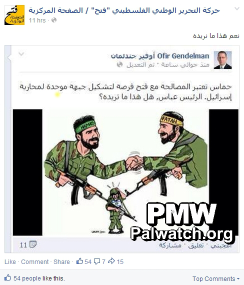 The post was in response to a post by the spokesman of Israel's Prime Minister's Office, Ofir Gendelman, which openly asked Mahmoud Abbas in Arabic if he saw reconciliation as a means to unite with Hamas to fight Israel. Gendelman's post included a cartoon of Hamas and Fatah fighters smiling, shaking hands and aiming rifles at an Israeli soldier. To his question about uniting to fight Israel - Fatah posted its answer: "Yes, this is what we want."