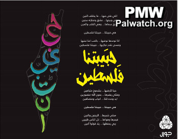 The PA daily published the above advertisement for the Jawwal Cell Phone company during Israel’s Operation Protective Edge in Gaza. On the ad is printed the lyrics of the song “Our beloved Palestine” with a map of Israel and the Palestinian areas beside it. The map is filled in with the text “our beloved.”