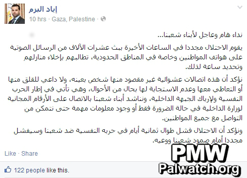 Statement posted on the Facebook page of Hamas Ministry of Interior spokesman Iyad Al-Buzum“An important and urgent call to our people: